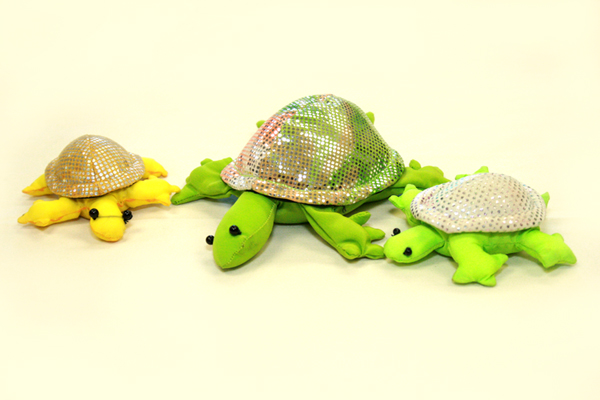 CO1: These are newer Hmong American craft items that do not incorporate Hmong embroidery. They are sold at craft shows, festivals, multicultural events, and Hmong shops. These are sand-stuffed turtles, cut from patterns and hand sewn, using synthetic, spandex or active wear fabrics. The targeted audiences are non-Hmong people, especially children and young adults, but Hmong children like them as well because of their soft feel. The middle turtle was purchased at the Dragon Festival in Saint Paul, Minnesota, in 2008, and the two smaller ones at the Lemon Festival in Saint Cloud, Minnesota, in 2002. Hmong women started making these crafts in the mid-1990s, inspired and influenced by the popular Beanie Baby fad. Instead of using small plastic beads, sand is utilized. These crafts now come in a wide variety of sizes, colors, and animals, including mythical creatures such as dragons, unicorns, fairies, and mermaids.