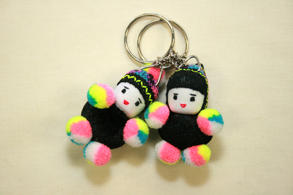 CO10: These are key chains made by Hmong residing in Thailand. The dolls picture a boy and a girl, both individually hand sewn. They are made of cotton fabric, yarn, and pompoms. The material used for the hats includes monk’s cloth as well as cross-stitch fabric, and they are decorated in running and cross-stitches.