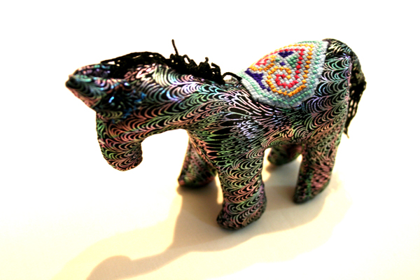 CO4: This stuffed horse is a Hmong American craft, which has now been produced in the United States for over a decade. The heart motif involves cross-stitch embroidery on monk’s cloth. The fabric used for the donkey is a shiny synthetic.
