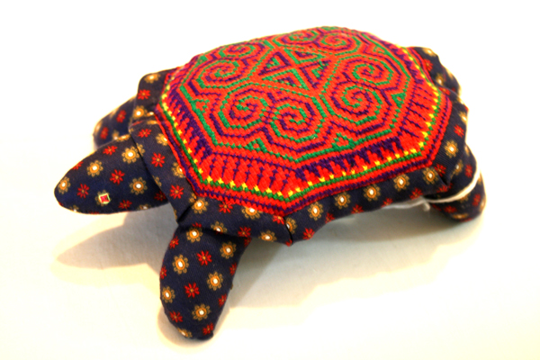 CO5:The animal depicted in this artwork is a turtle made of cotton fabric with the exception of its shell. The shell involves an embroidered inverted elephant’s foot motif done on red monk’s cloth. Note that this piece does not possess the standard elephant’s foot because the snails are facing outward. In the center of the motif the double triangles function as decoration, along with the mountains, seeds, and fences in the channels of the turtle shell.