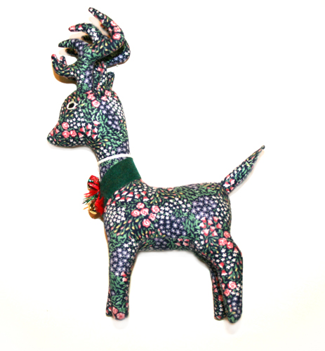 CO6: The animal shown in the photo is a reindeer. It was made with a floral pattern cotton fabric, and stuffed with cotton. The eyes of the reindeer were hand sewn with chain stitches. This piece was made in the United States. The reindeer is a Christmas icon; therefore, it was made to be sold as an ornament for Christmas to non-Hmong customers.