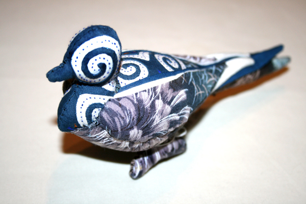 CO7: The technique used for this bird is rather rare. It is not common to see such methods utilized in Hmong crafts, especially stuffed animals. The piece was first constructed in reverse appliqué, and then cut into the shape of the bird, put together and hand-sewn. The spiral of the snail motif acts as the eye of a duck or dove.