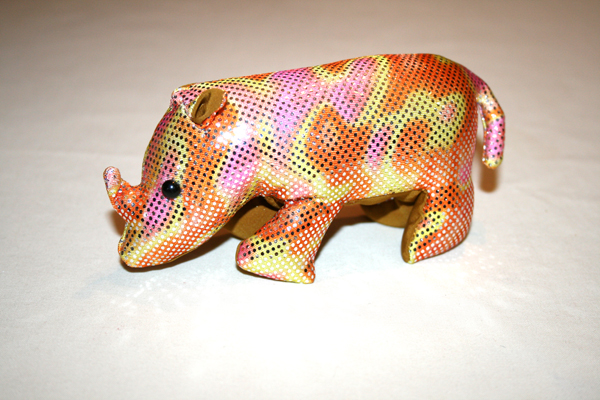 CO8: This stuffed animal is a Hmong American craft. It is a rhinoceros. Spandex fabric was cut into the shape of the animal, and hand-sewn. The animal was then individually stuffed with sand by hand. The completed product consists of a soft sand-stuffed animal. Crafts such as this one are often sold at art fairs and festivals, and are popular with children.