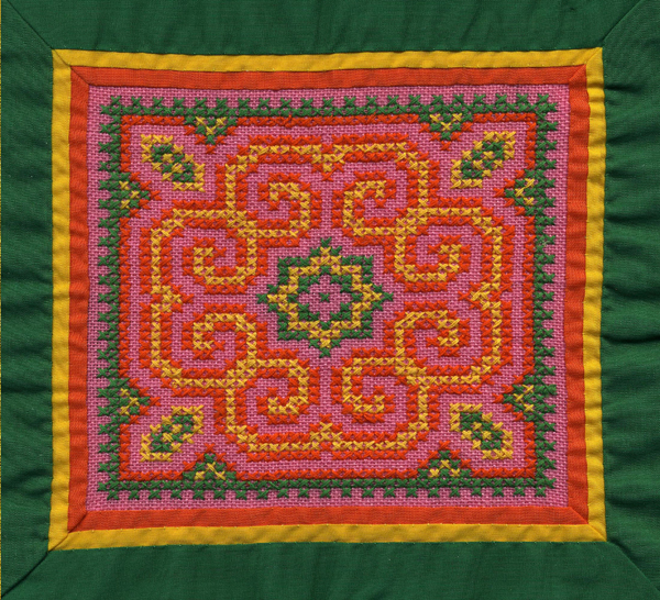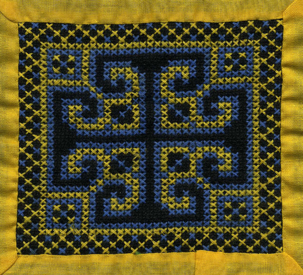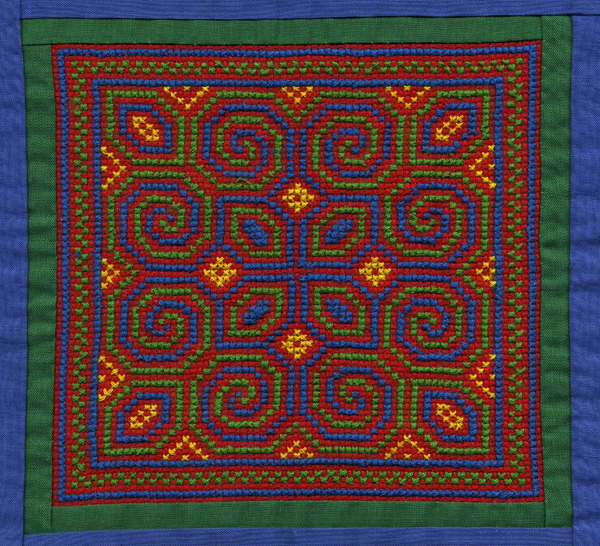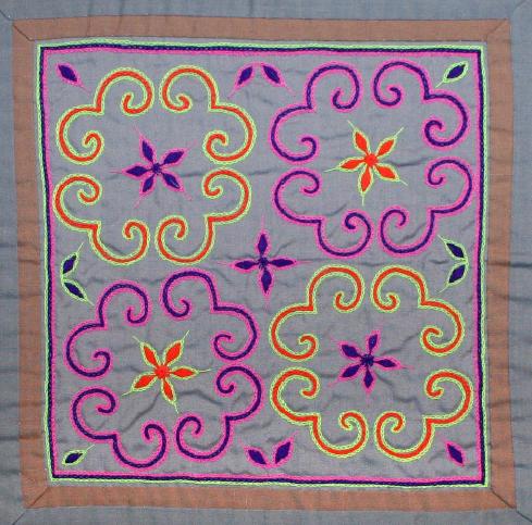 EO7: This cross-stitch floral paj ntaub was sewn as a small tablecloth or wall hanging. It is one of the very few Hmong Archives paj ntaub from the Hmong in China, most likely from eastern Guizhou Province, home of the donor. Other than it has geometric and floral designs, there is little we know about it, and welcome your comments.