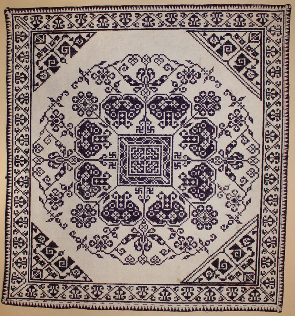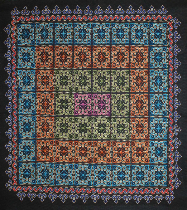 EO8: This embroidery provides an example of cross-stitch on a black monk’s cloth. The main motif includes negative space that was not embroidered. Also included is a complex bar with a square ends motif. At each corner is a square with a modified flower motif. Each of the four individual motifs resembles a heart motif, which as a whole, appear similar to an elephant’s foot. The complementary colors of yellow and black were used in the piece. The cross-stitch fence motif was used as a border decoration, with a yellow appliqué as an outer border.