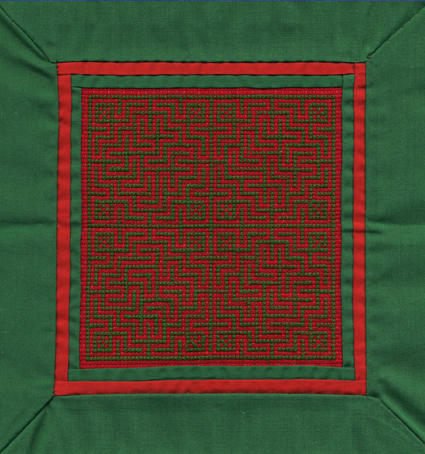 EO4: The colors featured in this cross-stitch piece include red and green on a monk’s cloth in a maze motif, repeated four times in quadrants. The appliqué borders provide a complementary decoration to the maze colors.