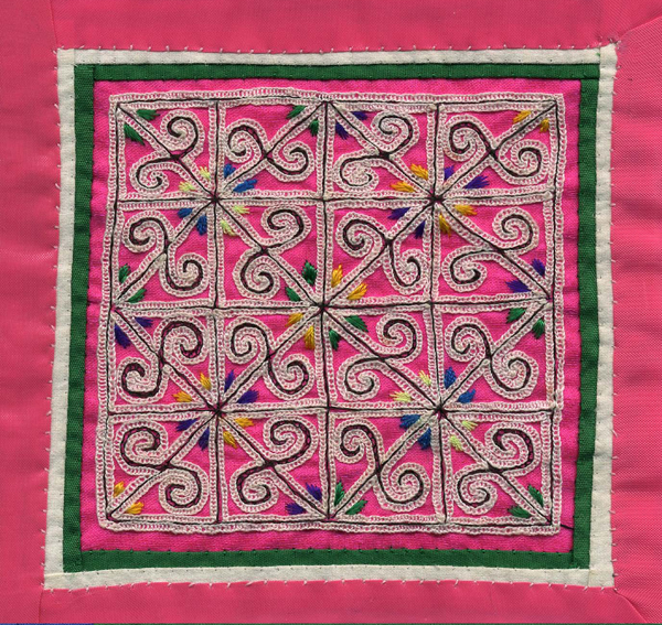 EO10: This paj ntaub square was done on pink monk’s cloth with cotton thread in a