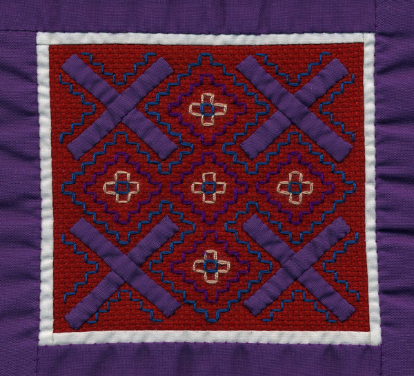 EO3: This paj ntaub is embroidered onto a red cross-stitch fabric.The approach used involved running stitches to create a leaf frond which is the main motif. Inside each leaf frond is a white and blue cross decoration. The tapestry is decorated with four purple diagonal bars appliquéd onto the red cross-stitch fabric. White and purple appliqué borders are used to frame and